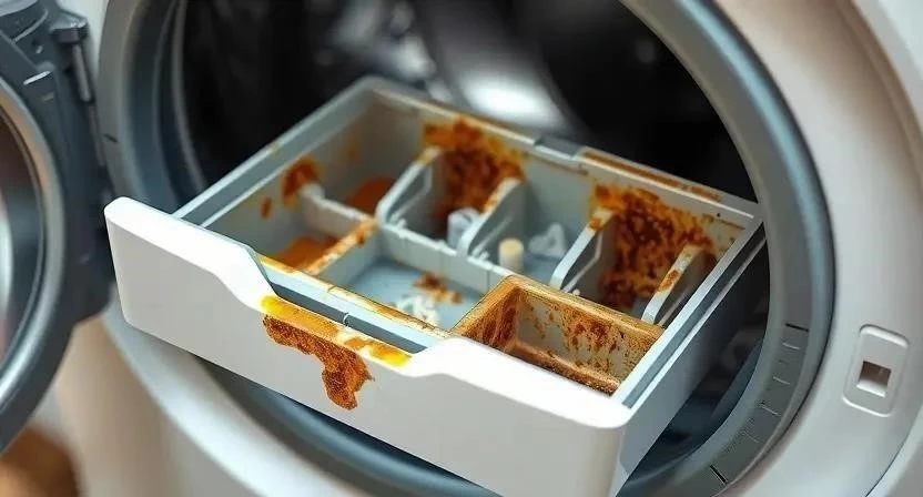 - Очистка отсека для порошка и кондиционера: Извлеките отсек, промойте его под проточной водой с использованием щетки и моющего средства. Удалите остатки порошка и кондиционера.