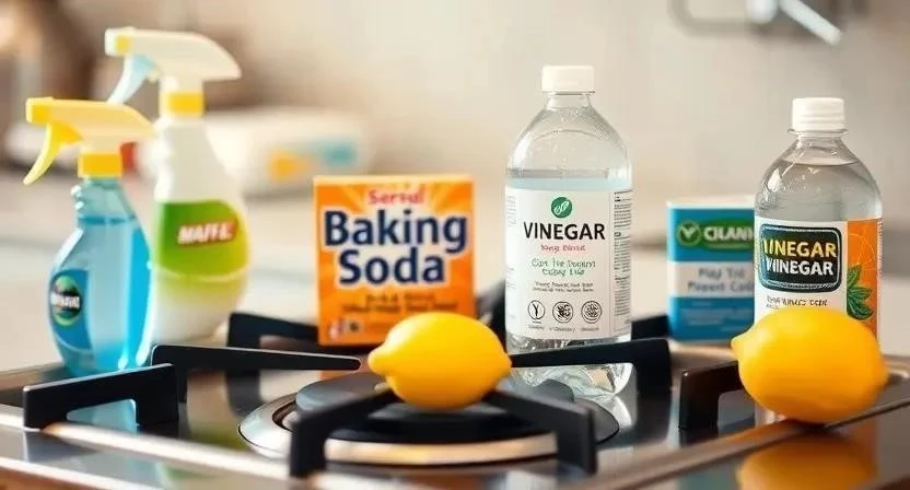 - Уксус: Смешайте уксус с водой в равных пропорциях и распылите на плиту. Оставьте на 10-15 минут, затем протрите.