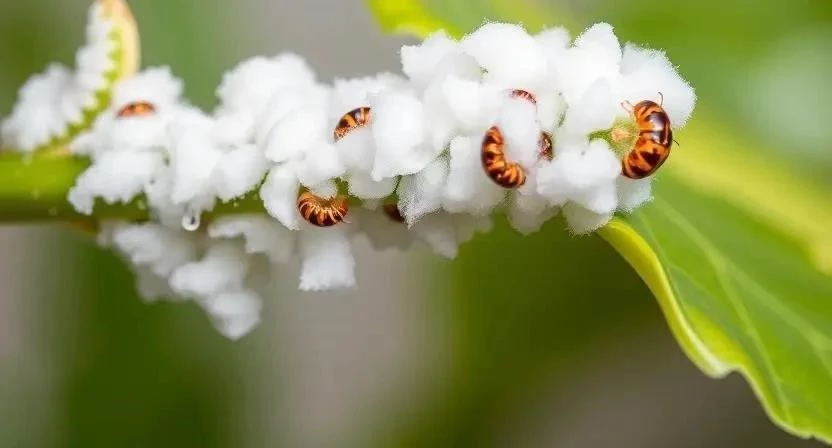 Мучнистый червец: Эти вредители выглядят как маленькие белые комочки ваты. Они также высасывают сок из растения, оставляя после себя липкую субстанцию, на которой развивается сажистый грибок. Мучнистый червец быстро размножается и может поражать все части растения. Жизненный цикл мучнистого червеца составляет около 2-3 месяцев. Самки откладывают яйца в восковом мешочке, который защищает их от внешних воздействий.