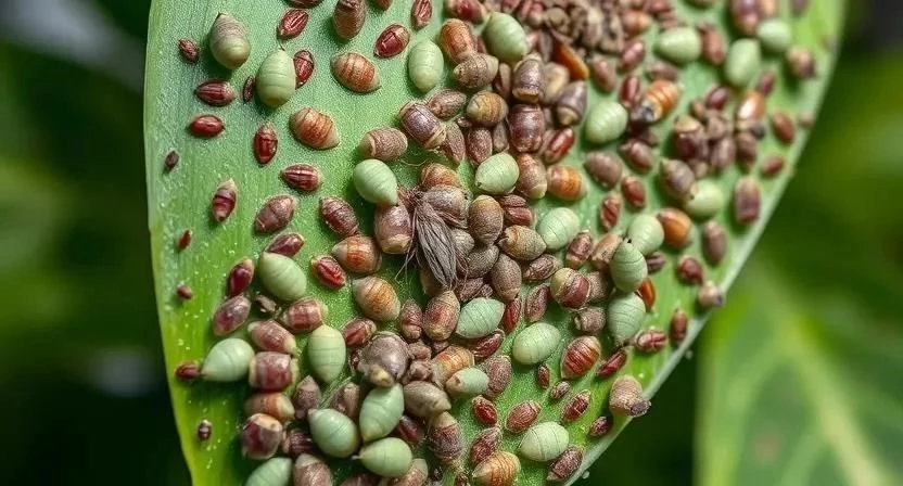 Щитовка: Эти насекомые выглядят как маленькие коричневые щитки, прикрепленные к листьям и стеблям. Они высасывают сок из растения, ослабляя его и вызывая пожелтение листьев. Щитовки очень живучи и трудно поддаются уничтожению. Жизненный цикл щитовки длится от нескольких месяцев до года, в зависимости от вида и условий окружающей среды. Самки откладывают яйца под щитком, из которых вылупляются личинки, которые затем расселяются по растению.