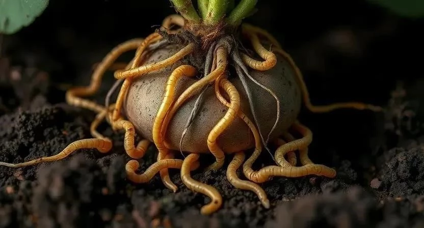 - Проволочник: Личинки жука-щелкуна, повреждают клубни картофеля, корни моркови и других корнеплодов.