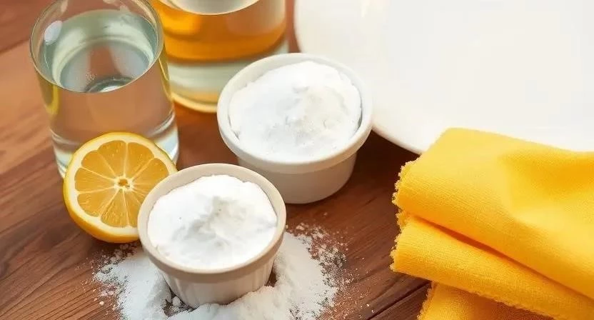 - Сода: Сделайте густую пасту из соды и небольшого количества воды. Нанесите на пятна и потрите губкой. Сода действует как мягкий абразив.