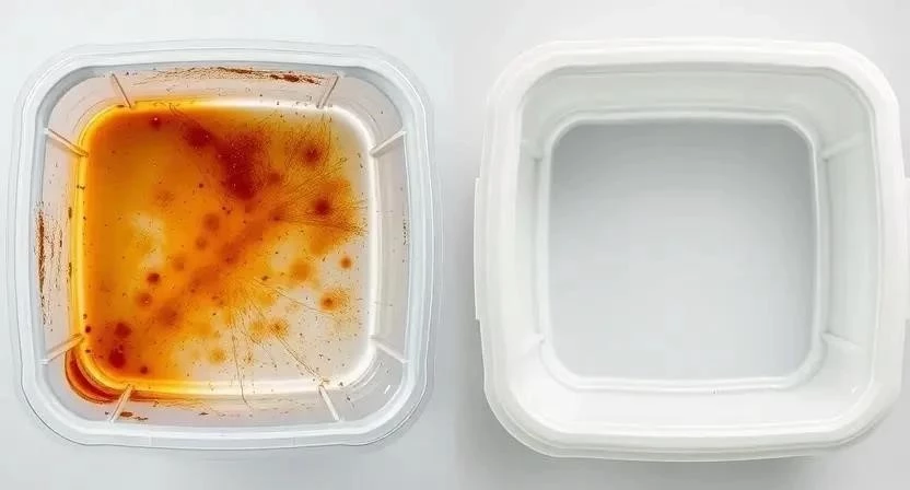 Используйте специальные средства для пластика или регулярно очищайте контейнеры содой и уксусом.