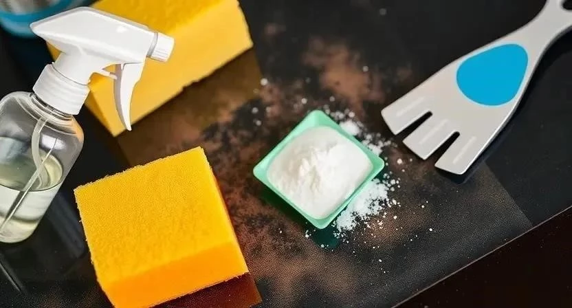 Ответ: Используйте пасту из соды и уксуса, нанесите на загрязненную поверхность, оставьте на 15-20 минут, затем потрите губкой и смойте водой.