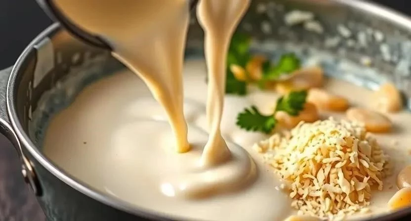 - Влейте сливки, добавьте соль, перец и мускатный орех (если используете).
