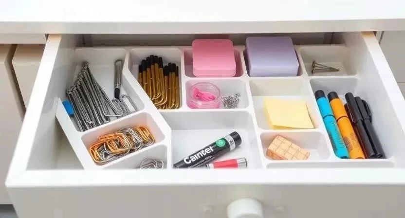 Ящики и комоды – это отличный способ спрятать канцелярию и создать визуальный порядок. Используйте ящики разного размера для разных категорий предметов. Организуйте внутреннее пространство с помощью разделителей и контейнеров. Я, например, использую небольшие пластиковые контейнеры для хранения скрепок, кнопок и других мелких предметов.