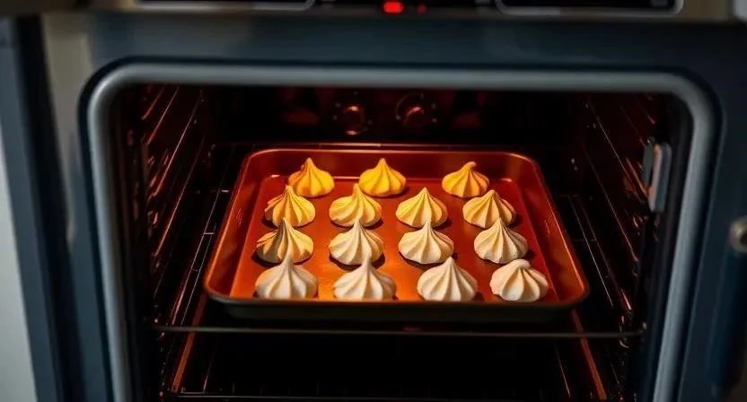 Разогрейте духовку до 100°C. Поставьте противень с безе в духовку и выпекайте в течение 1,5-2 часов. Время выпекания зависит от размера безе и вашей духовки. Безе должно стать сухим на ощупь и легко отделяться от пергаментной бумаги. Я всегда проверяю готовность, слегка приподняв одно безе – если оно легко отходит, значит, все готово.