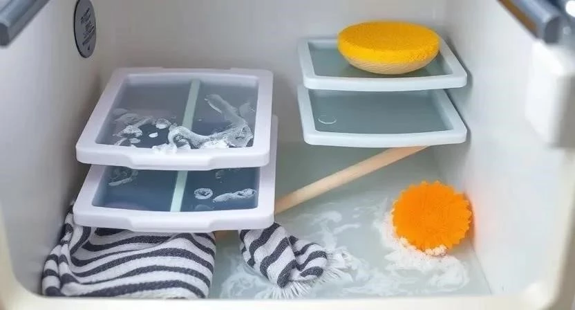 - Мытье полок и ящиков: Вымойте полки и ящики в теплой воде с добавлением средства для мытья посуды. Для стойких загрязнений можно использовать раствор соды (2 столовые ложки на литр воды).