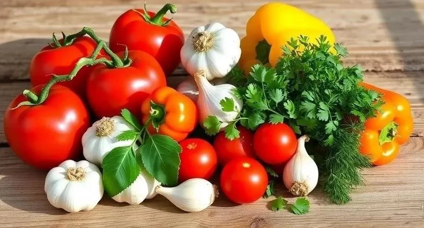 При выборе помидоров отдавайте предпочтение спелым, мясистым плодам с небольшим количеством семян. Болгарский перец должен быть ярким и упругим. Перец чили выбирайте в зависимости от желаемой остроты. Чеснок должен быть плотным и без признаков гнили. Специи лучше покупать свежие, молотые.
