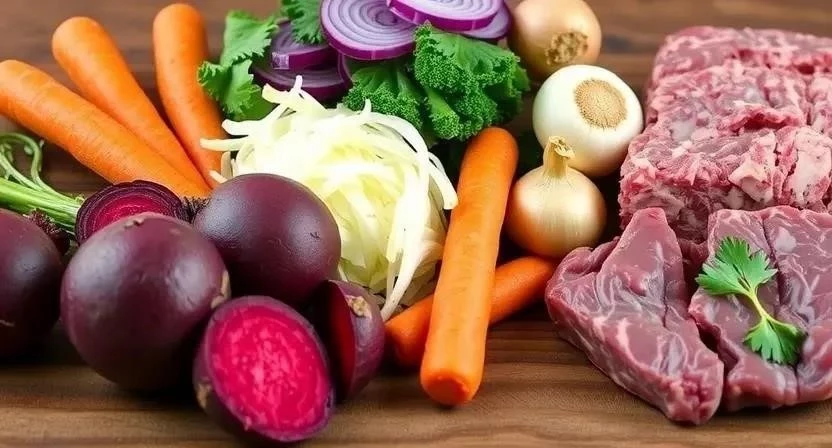 Для приготовления настоящего домашнего борща нам понадобятся качественные ингредиенты. Выбор мяса играет ключевую роль – я предпочитаю говядину на кости, она придает бульону особую насыщенность. Свеклу выбирайте темно-бордового цвета, она должна быть твердой и без повреждений. Примерно 500-600 грамм говядины на кости, 2-3 средние свеклы, 3-4 картофелины, 1/2 небольшого кочана капусты, 1 большая луковица, 1-2 моркови, 2-3 зубчика чеснока, 2-3 столовые ложки томатной пасты, 1-2 столовые ложки уксуса (9%), 1 столовая ложка сахара, лавровый лист, черный перец горошком, соль по вкусу, сметана и свежая зелень для подачи.