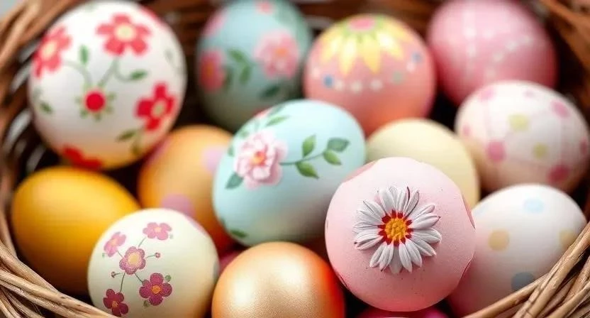 - Яйца, украшенные узорами: Использование воска, наклеек или других материалов для создания уникальных рисунков на яйцах.