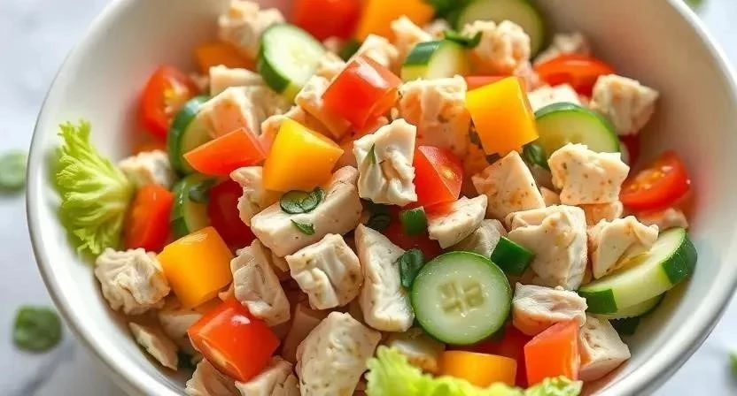 - Смешайте курицу, овощи и заправьте оливковым маслом с лимонным соком.