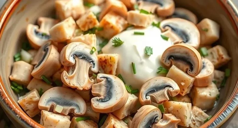 Этот салат – отличный вариант для тех, кто любит грибы. Сочетание курицы и грибов создает насыщенный и ароматный вкус. Однажды я решил добавить в этот салат немного грецких орехов, и это оказалось просто гениальным решением!