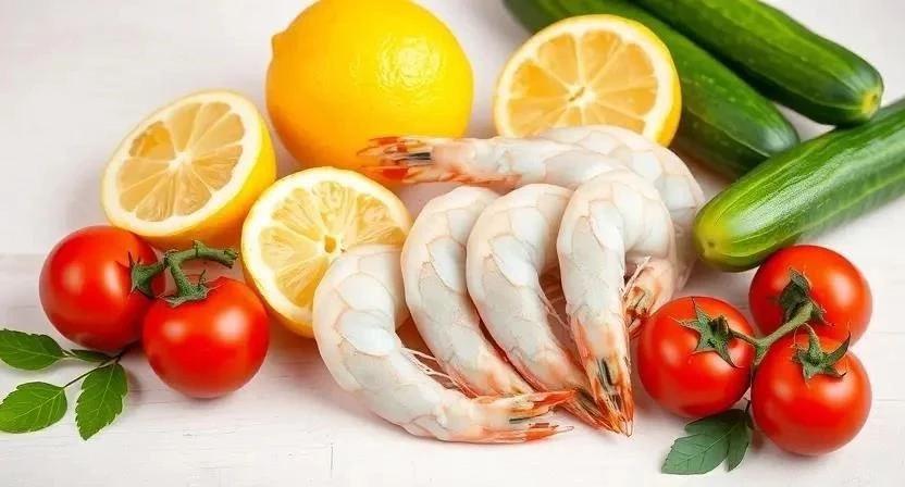 Для приготовления этого замечательного салата нам потребуется: 200 г креветок (очищенных), 1 огурец, 2 помидора, 1/2 авокадо, пучок салата (айсберг или романо), 2 столовые ложки оливкового масла, 1 столовая ложка лимонного сока, соль и перец по вкусу, немного чеснока (по желанию).