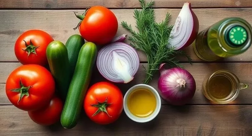 Для приготовления этого простого салата нам потребуется совсем немного ингредиентов: 3-4 средних помидора, 2-3 огурца, небольшой пучок зелени (укроп, петрушка), 2 столовые ложки растительного масла (подсолнечное или оливковое), 1 столовая ложка уксуса (яблочный или винный), соль и перец по вкусу. Всего около 450 знаков.