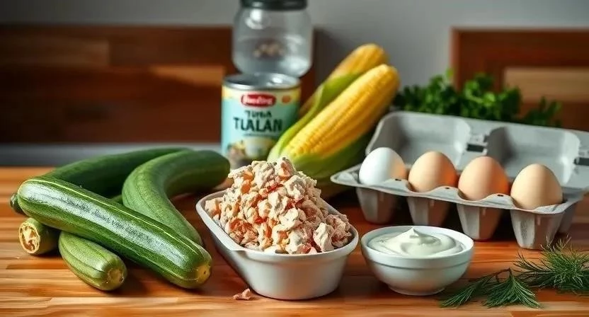 - В большой миске смешайте тунец, яйца, огурцы, кукурузу и лук (если используете).