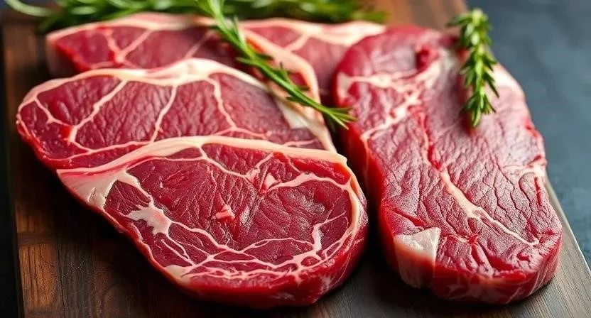 - Говядина: Обратите внимание на цвет – он должен быть ярко-красным. Мраморность (наличие жировых прожилок) говорит о нежности мяса.
