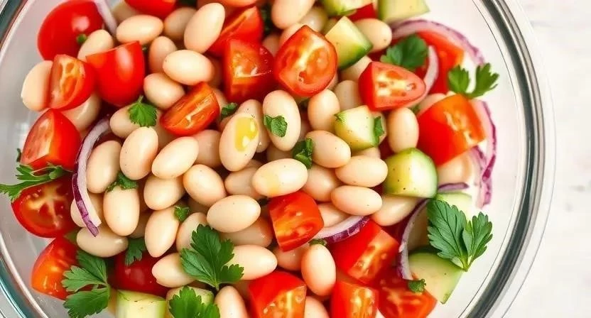 - Ингредиенты: 1 стакан вареной фасоли, 1 огурец, 1 помидор, 1/2 луковицы, зелень, оливковое масло, лимонный сок, соль, перец.