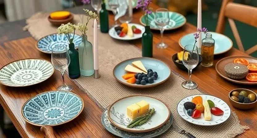 2. Посуда: Керамические тарелки, глиняные бокалы, металлические подносы.