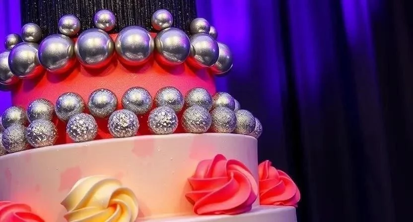 Ответ: Торт можно украсить разноцветной глазурью, съедобными блестками, диско-шарами из мастики и другими ретро-элементами.