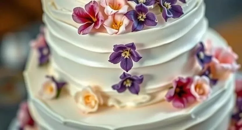 | Торт «Цветочная феерия» | Розы, фиалки | Торт, украшенный свежими и засахаренными цветами |