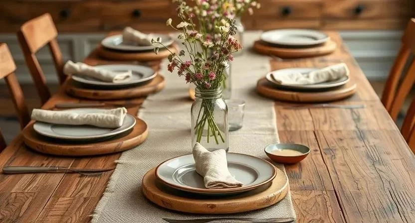 | Рустикальный | Простота, натуральность | Дерево, керамика | Осенние листья, шишки |