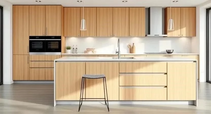 - Кухня: В кухне можно использовать кухонный гарнитур с гладкими фасадами, столешницу из камня и барные стулья. На стенах можно повесить несколько полок для посуды и специй.
