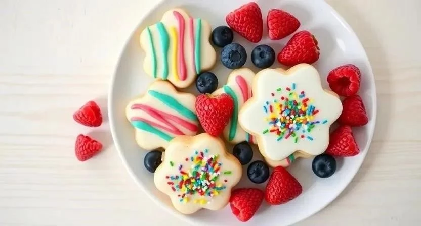 Цветная феерия: Глазурь и драже. С помощью готовой или домашней глазури и разноцветного драже можно создать яркий акцент на тарелке и самих печеньях. Для этого нужно нанести глазурь на часть печенья, посыпать драже и дать застыть. Это быстро, просто, ярко и создает праздничное настроение. Я помню, как однажды, когда у меня было мало времени на подготовку к детскому празднику, этот способ спас меня. Дети были в восторге от разноцветных печенек!