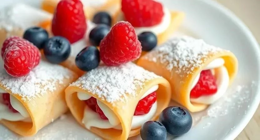 - Что нужно: Вафельные трубочки, крем (заварной, сгущенка, маскарпоне), свежие ягоды (клубника, малина, голубика).