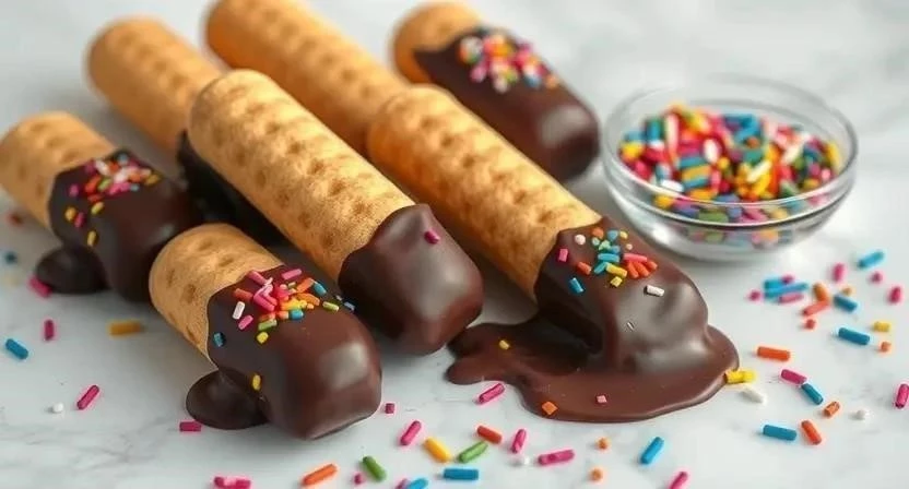 - Описание: Как превратить обычные вафельные трубочки в произведение искусства с помощью растопленного шоколада и кондитерской посыпки.