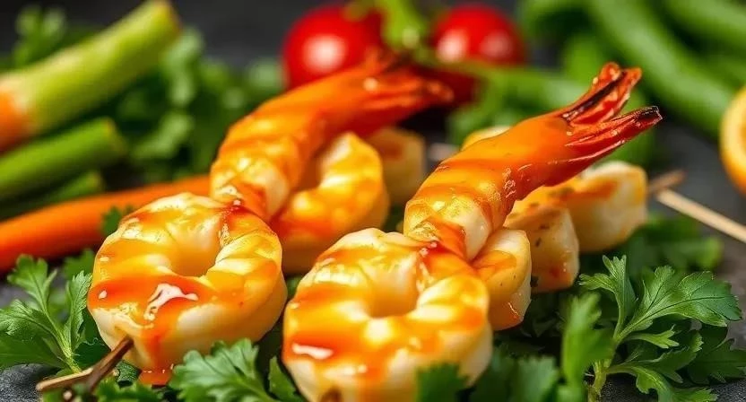 | Креветки на шпажках | Креветки, соевый соус, мед, лимонный сок, имбирь |
