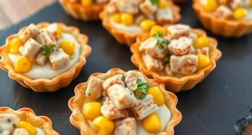 Эти тарталетки – настоящая находка для тех, кто любит морепродукты. Для приготовления вам понадобятся готовые тарталетки, консервированный тунец, кукуруза, майонез, лимонный сок и зелень. Смешайте тунец с кукурузой, добавьте майонез и лимонный сок, хорошо перемешайте. Наполните тарталетки полученной смесью и украсьте зеленью. Я помню, как однажды приготовил эти тарталетки на день рождения друга, и они были съедены в первую очередь!