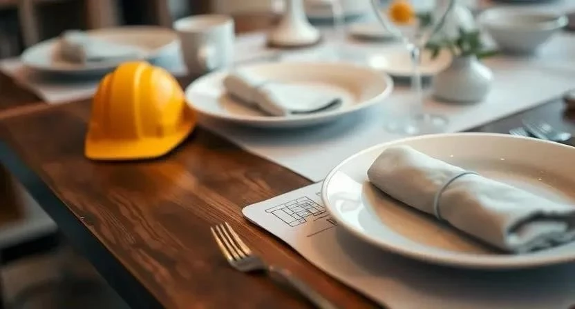 Для Дня строителя я рекомендую использовать белые тарелки – они универсальны и подходят к любому декору. Можно добавить тематические акценты с помощью салфеток или подставок под приборы. Столовые приборы располагайте в соответствии с правилами этикета: вилки слева, ножи и ложки справа. Не забудьте про сервировочные тарелки – они придают столу более торжественный вид.