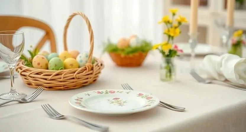 | Традиционный | Белый, золотой | Фарфор, лен | Пасхальные яйца, цветы |