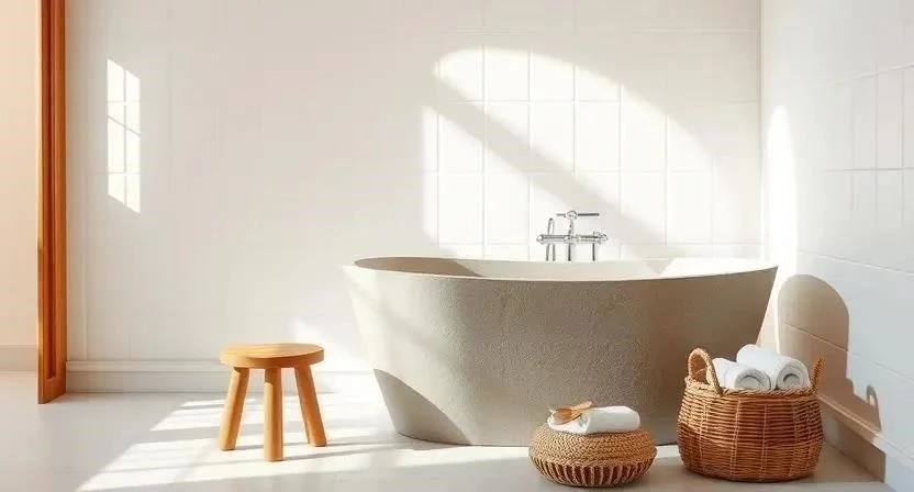 Вопрос: Как создать атмосферу Средиземноморья в ванной комнате? Ответ: Используйте керамическую плитку, деревянную мебель, зеркало в раме из дерева, растения в горшках.