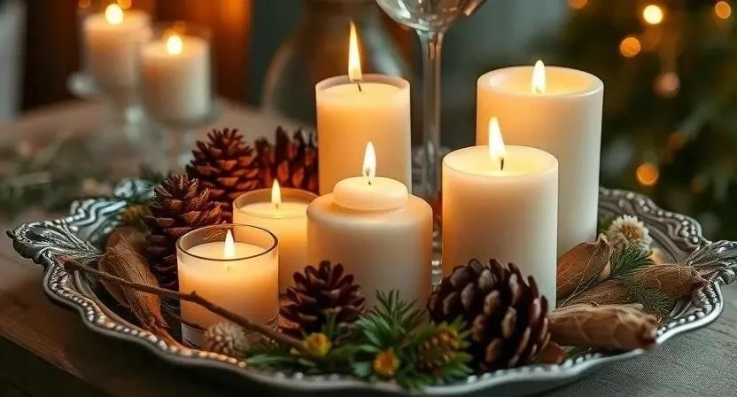 - Композиция из свечей на деревянном подносе, дополненная шишками и еловыми ветками.
