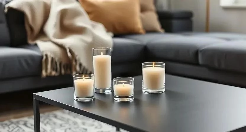 2. В гостиной: большие декоративные свечи на журнальном столике.