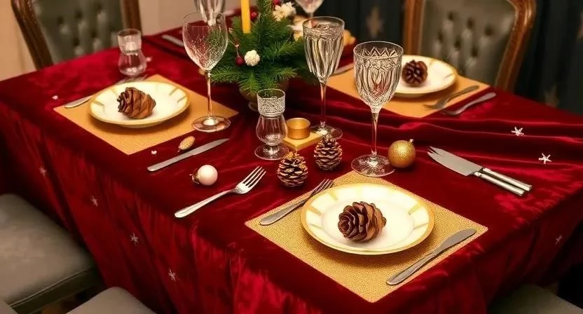 | Новогодняя | Атлас, бархат | Серебряный, золотой, красный | Салфетки с новогодним принтом, дорожка с блестками |