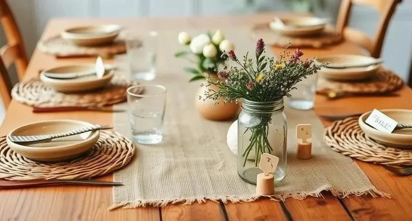 Кантри сервировка: Деревянные тарелки, плетеные корзины, льняные салфетки. В качестве декора – цветы в корзинах, деревянные подставки и свечи в банках.