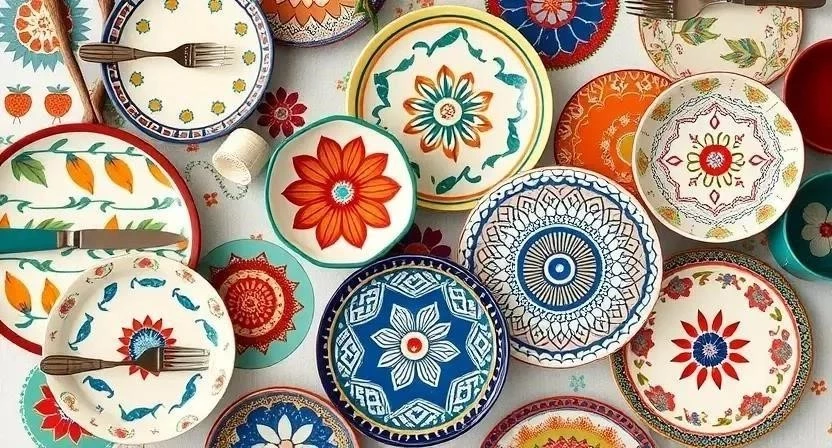 - Бохо-орнаменты: Растительные и геометрические мотивы в стиле бохо добавляют легкости и непринужденности. Такая посуда отлично подойдет для летних посиделок на природе.