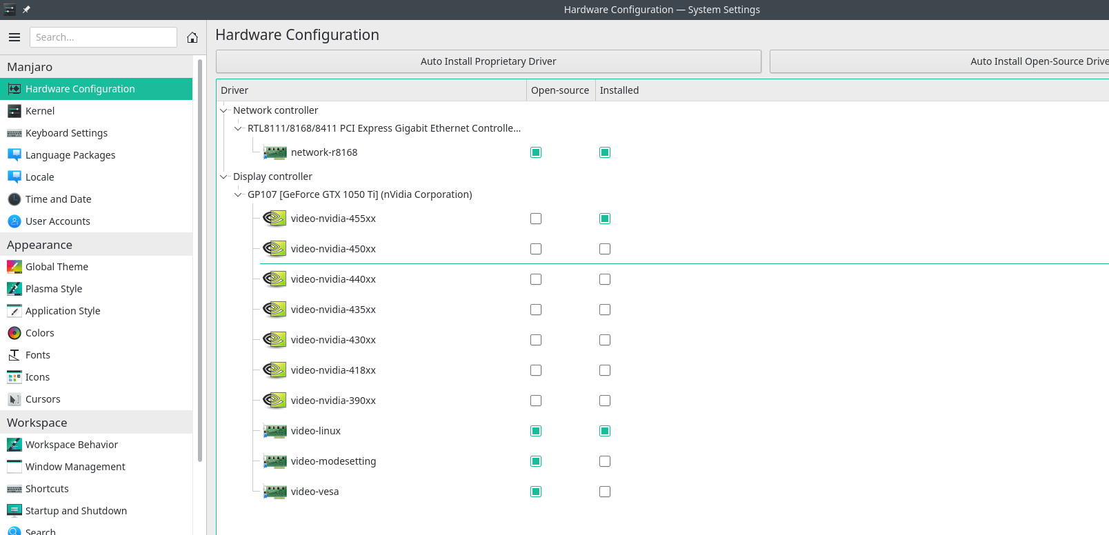 В Manjaro нужно зайти в настройки и выбрать пункт устройства. После чего нажать кнопку «Auto Install Proprietary Drivers» или выбрать конкретный драйвер: