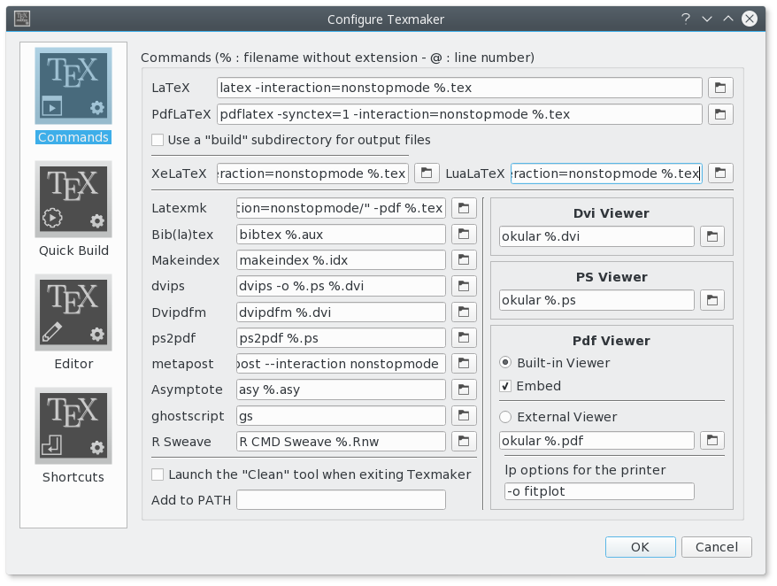 If the paths to the LaTeX-related commands are incorrect, Texmaker won’t be able to build your documents. You will need to make changes to the default settings (under “Configure Texmaker” -> “Commands”) for them to operate with the most recent and joint LaTeX distributions.