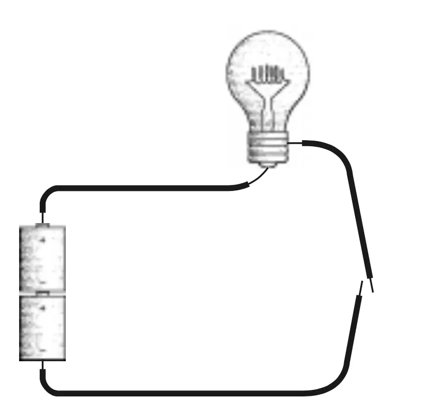 Чтобы лампочка загорелась, цепь должна быть замкнутой. Переключатель управляет замыканием и размыканием цепи. По замкнутой цепи «течёт» поток заряженных частиц, электронов, от одного атому к другому.