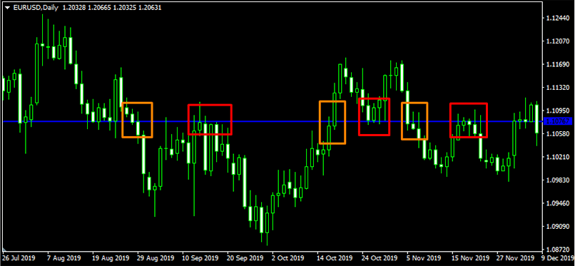 Например, вот я выделяю синими прямоугольниками пробои, а красными – ситуации, когда рынок использует пробитый уровень как поддержку или сопротивление.