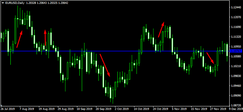 Например, вот у нас дневной график, каждая свечка на нем обозначает ценовые колебания в течение дня. Хай свечи за 11 февраля находится на уровне 1,21488.