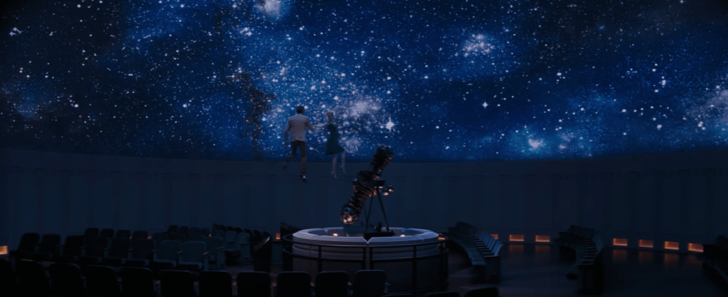 На первом «настоящем» свидании Себастьян и Миа идут в кино, причем смотрят не новинку, а старый кинохит «Бунтарь без причины» (1955). Когда фильм прерывается, герои отправляются в Обсерваторию Гриффита — реально существующее заведение, объединяющее под одной крышей планетарий, музей, различные выставки и т.д. Таким образом они как бы продолжают фильм, оборвавшийся на кадрах с обсерваторией: их реальность становится столь же захватывающей, как кино (и даже лучше, так как «Бунтарь без причины» — драма о несовершеннолетних преступниках). В то же время обсерватория предстает неким символическим образом, намекающим, с одной стороны, на мир звезд, которыми мечтают стать герои, а с другой — на волшебную силу любви, поднимающую над землей: души героев, так сказать, воспарили в небеса.