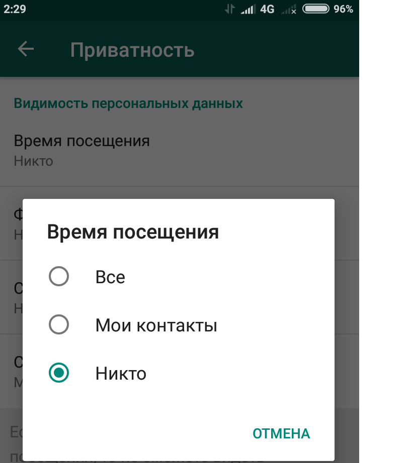 Если вы предпочитаете не показывать людям, когда их сообщение прочитано вами, тогда отключите это «Настройки» — «Аккаунт» — «Приватность» — здесь снимите галочку «Отчеты о прочтении». (Учтите, что отключая отчеты о прочтении, вы не сможешь видеть сами отчеты о прочтении других пользователей.).Здесь же, в меню «Приватность» можно выбрать, кто может видеть вашу персональную информацию, сведения, фото профиля, статус и время когда последний раз были он-лайн. Выставляя «Время посещения» — «Никто»- учтите, что вы тоже не сможете увидеть, кто из ваших контактов был он-лайн последнее время.