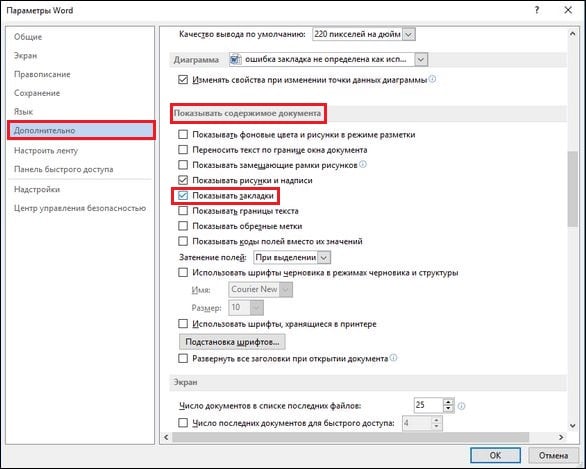 Далее перейдите во вкладку «Дополнительно», там найдите подраздел «Показывать содержимое документа», поставьте галочку на опции «Показывать закладки», после чего сохраните изменения, нажав на «Ок».