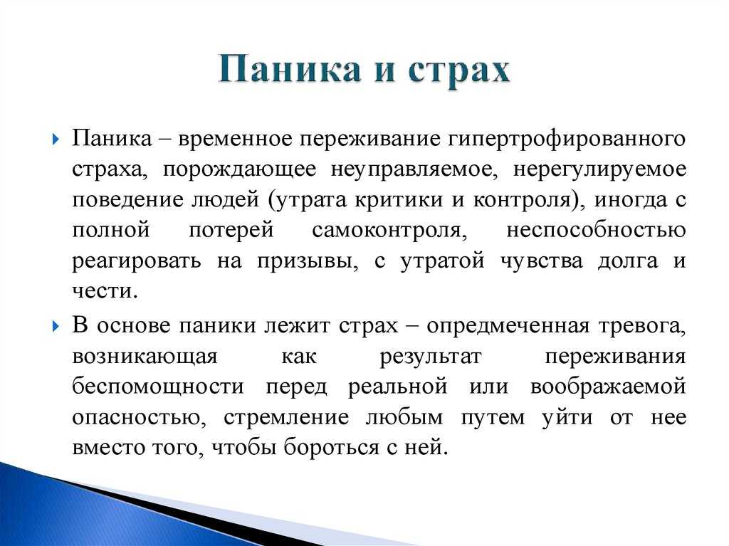 В частности, тревожные реакции запускаются в результате физических усилий, направленных на то, чтобы подавить эмоции. Если человек осознает, что в данный момент ему не угрожает опасность, но при этом испытывает сильное беспокойство, можно предположить об иррациональной тревоге. Паника сочетает в себе зашкаливающий страх и интенсивную тревогу. Человек, испытывающий панику, утрачивает контроль над мышлением и поведением. В такой ситуации он действует нелогично, непоследовательно.
