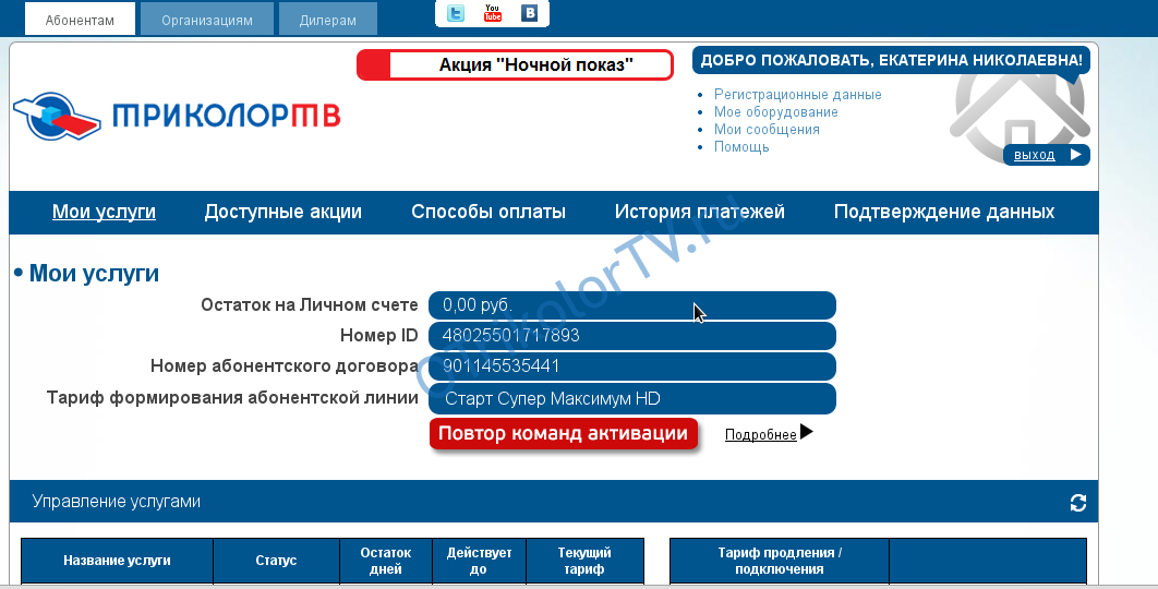 Если предыдущий вариант не помог, и активационные команды в автоматическом режиме отправлены не были, стоит запросить их самостоятельно. Для этого необходимо зайти в личный кабинет абонента на сайте Триколор. В меню кабинета есть вкладка «Мои услуги». Перейдя по ней, абонент увидит данные о состоянии своих подписок, а под ними красную кнопку «Запрос команд активации». На эту кнопку необходимо нажать, а затем повторить все действия, описанные в пункте выше.
